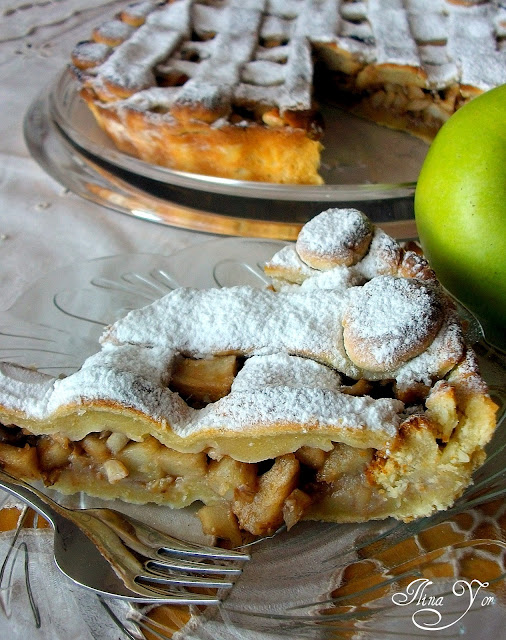 Според мене сладкиша е по-вкусен, когато се поднесе добре охладен, защото не ми допада вкуса на гореща ябълка. Този ябълков пай сякаш се получи по-сух от очакванията ми, може би защото го сравнявам с други, които правя по-често и горещо ви ги препоръчвам да опитате - ябълков сладкиш и пай с ябълки. Този сладкиш е безспорно по-красивият, но пък е и по-трудоемък от другите два. Струва си да се изпробва. Рецептата е от Кухнята на пипилотките, като аз си я поизмених малко, не толкова като съдържание, колкото като ред на приготвяне.