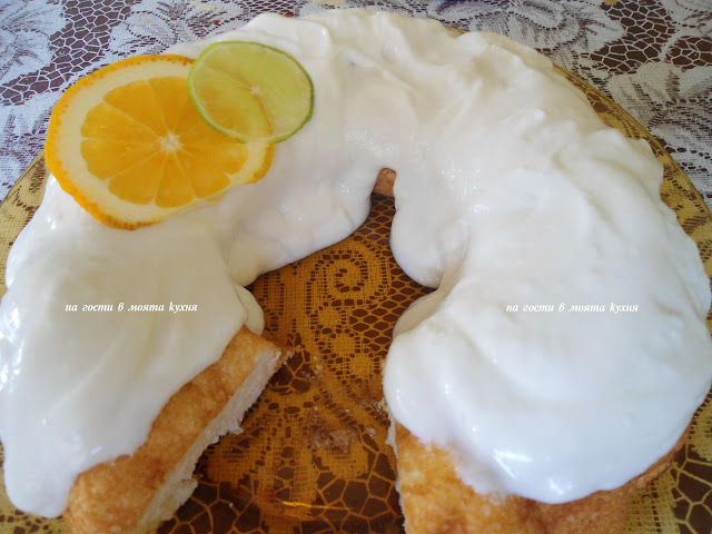 Във форма не намазана с масло (обикновено се използва висок съд с кръгла дупка вътре и подвижна основа, но може и обикновена кексова форма) с диаметър 26 см с голяма лъжица се сипва тестото. Приглажда се с лопатка и се изпича в предварително загрята до 160 С фурна за 50-60 минути. Изважда се и се охлажда на стайна температура напълно за няколко часа, като се изважда от формата и се обръща в десертна чиния. Може да се украси с разбита сметана, пресни плодове според сезона или със сладък сос по желание.