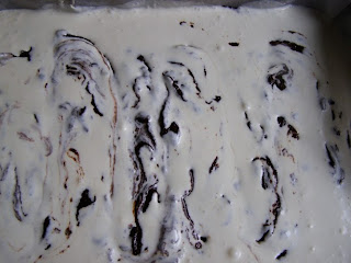 8. Сверху выложим крем из маскарпоне. У меня получился жидкий крем (похоже маскарпоне не очень хорошего качества). Если маскарпоне от хорошего производителя, то крем должен получиться густым, тогда можно пирожные-конфеты сделать трехслойными. Я же крем вылила поверх шоколадного теста и сделала подобие мраморного узора