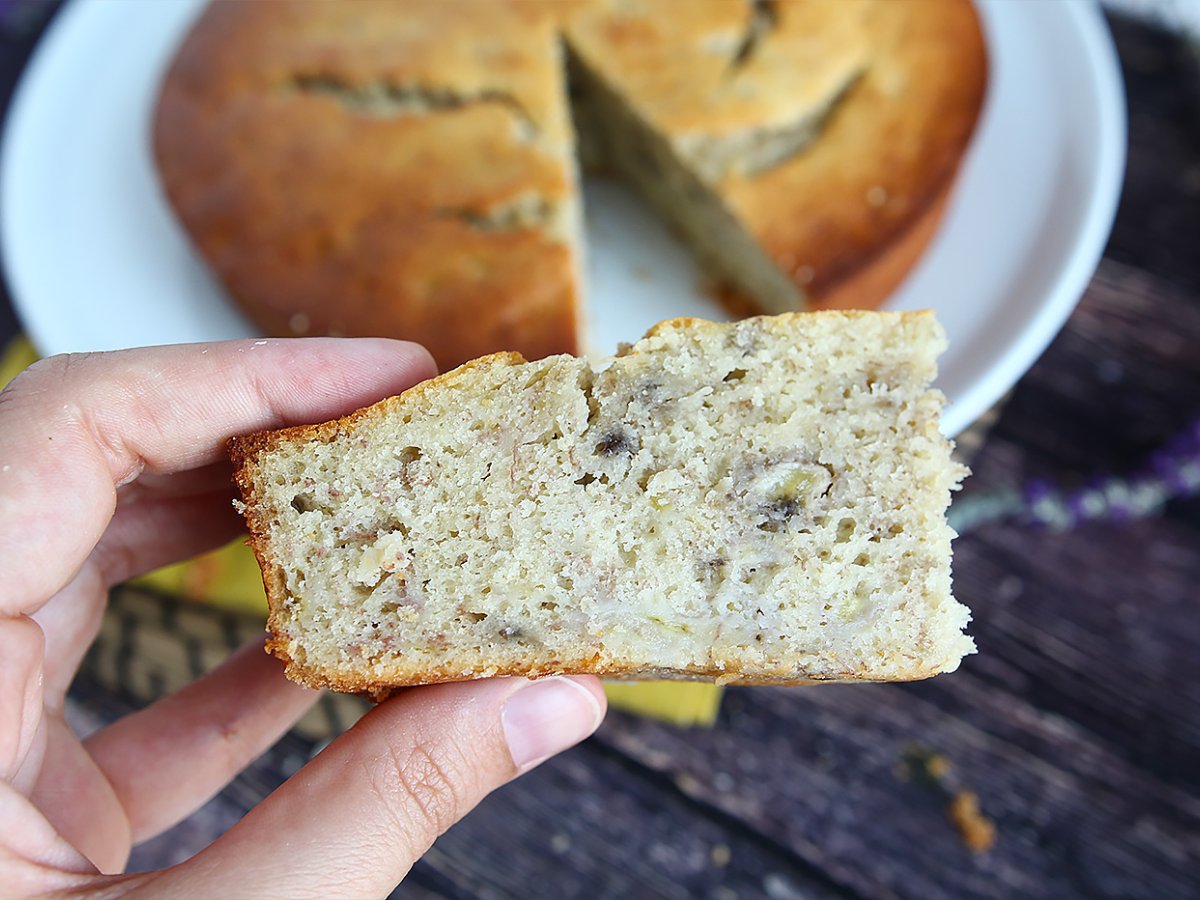 Когда смесь станет гладкой, добавьте пюре из бананов. Вылейте тесто в смазанную форму.