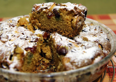 В намаслена и поръсена с брашно форма изсипах кексовата смес, отгоре поръсих орехите, локума и плодовете.