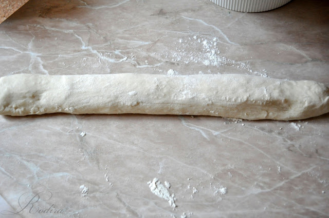 Тесто получается довольно мягкое и слегка липкое, так что приходится добавлять муку на присыпку. Если Вы уже делали похожий хлеб, к примеру, чиабатту, то Вам наверняка это знакомо, так как тесто получается примерно такое же. Но не надо сильно стараться с мукой, если вы добавите ее слишком много сверх нормы, то тесто потеряет необходимую эластичность и мягкость.