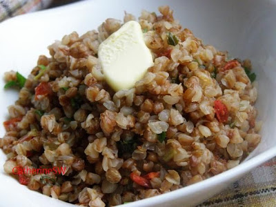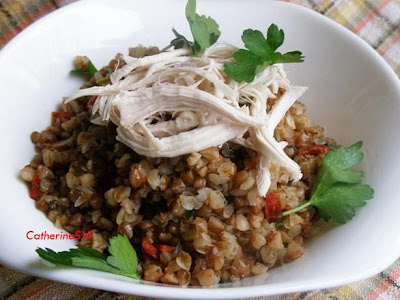 В моей семье не любят очень яркий вкус гречки. Поэтому, готовя блюдо из этой полезнейшей крупы, я прибегаю к помощи разных ароматических добавок. Благодаря вкусным дополнениям, гречка вполне претендует на самостоятельность, но для любителей мяса можно отварить в подсоленной воде куриное филе и разобрать его на тонкие волокна - и есть такое филе приятно, и его вкус не будет доминировать или еще хуже не пойдет в разрез и так довольно яркому вкусу гречки с травами. Здесь другой вариант гречки