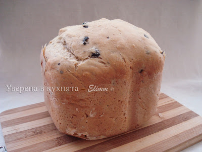 Нарязвате на ситно ригана и маслините. Добавяте и двата продукта към тестото и замесвате отново. Поставете тестото в правоъгълна форма, намазана предварително с мазнина и оставяте да втаса. След като това стане сложете хляба в предварително загрята фурна на 180 градуса и изпечете за златиста коричка.