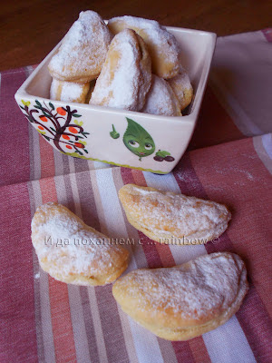 Извадете тестото от хладилника. Върху набрашнен плот разточете кора с дебелина около 3-4 мл. Изрежете кръгчета, сложете от плънката в средата и затворете кръгчето като мида. Притеснете добре краищата, за да не се отвори при печенето и да не изтече плънката. Намажете сладките с разбит белтък. Печете в предварително загряла на 190 градуса фурна за 15-20 минути. Извадете от фурната и още топли поръсете с пудра захар.