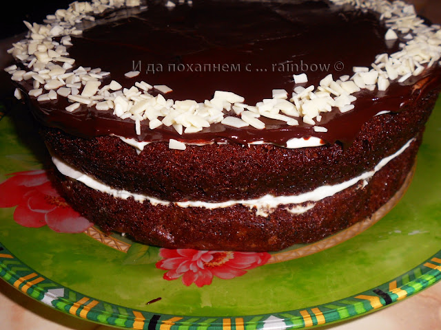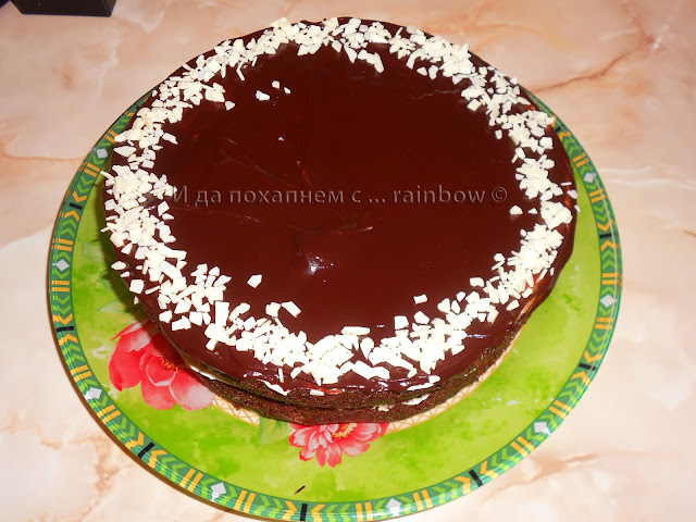 В подходяща чиния слагате единия блат. Върху него изсипвате крема, като оставяте около 1/2 ч.ч. за втория блат, заравнявате. Слагате втория блат и подмазвате повърхността му с останалия крем. Поливате с глазурата и украсявате с парченца бели шоколадови стърготини.