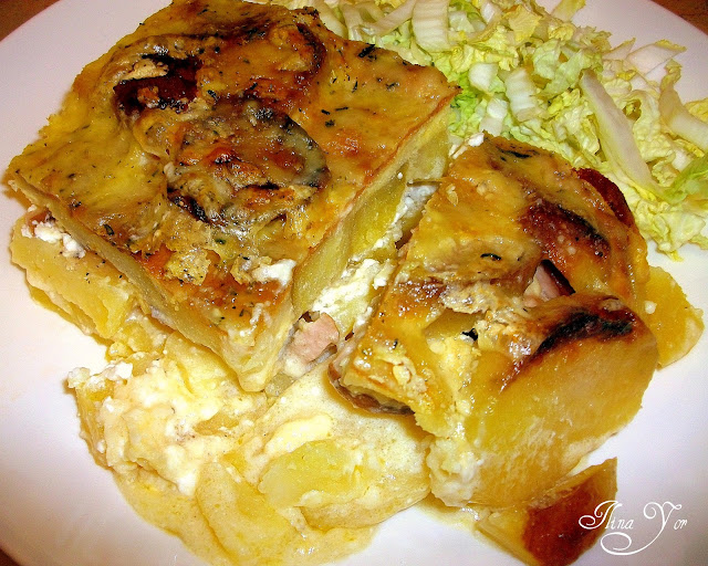 Необходими продукти: 1,5 кг картофи; 2 - 3 бр. шунка (мек колбас); 500 мл течна сметана за готвене;150 – 200 г сирене;1 - 2 яйца; 1 - 2 с.л брашно; 1 с.л. олио;Черен пипер; Сол.