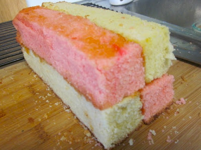 Смазываем стороны двух бисквитных брусков разного цвета и соединяем их вместе.