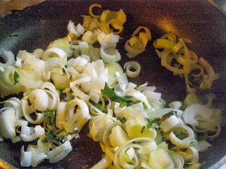 4. Лук-порей нарежем. Помидоры очистим от кожицы и семян, нарежем. 1 зубчик чеснока порубим. Стебли петрушки мелко порубим. На масле обжарим чеснок и стебли пертушки, чуть тимьяна и прованских трав,