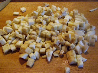 10. Пока баклажаны варятся, порежем оставшийся баклажан кубиком