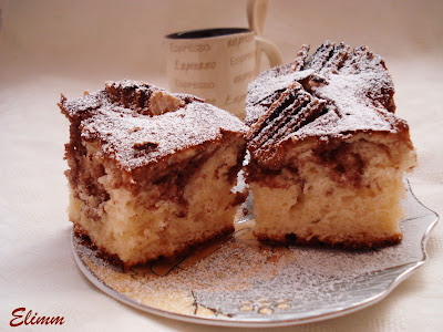 Приготвяне:В купа сложете брашното, захарта и бакпулвера, и разбъркайте добре. Добавете към тази смес яйцата, млякото, олиото и ванилиите. Разбъркайте добре с тел, не е необходимо да разбивате с миксер, трябва да се получи еднородна смес. Намажете си формата за кекс с мазнина и малко брашно.Отделете 1 к.ч. от сместа и оцветете с какаото. Изсипете кексовото тесто/ балата смес/във формата, разпределете и кафявата част отгоре и с клечка за зъби разбъркайте за да се нашари кекса. Печете в предварително загряла фурна на 200 градуса за около 30 мин. или до суха клечка. След като са минали 10 мин. от печенето извадете кекса и поставете парчетата вафла, като притиснете да потънат в тестото. Внимавайте да не се изгорите, кекса е горещ!!! Готовия кекс поръсете с пудра захар още докато е топъл.