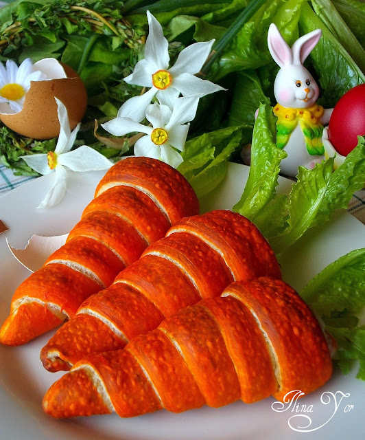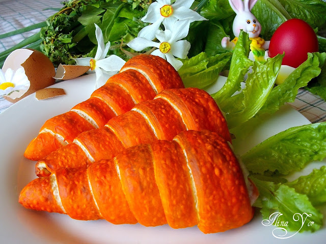 1 опаковка (600 г ) семейно тесто за пица BELLA; 1 бр. яйце (смесено с 1 ч.л. вода, за намазване на фунийките); Течна оранжева хранителна боя (смес от жълто и червено) 1 ½ чаши от любимата ни яйчена или шункова салата; 1 връзка пресен копър или магданоз. Олио за намазване.