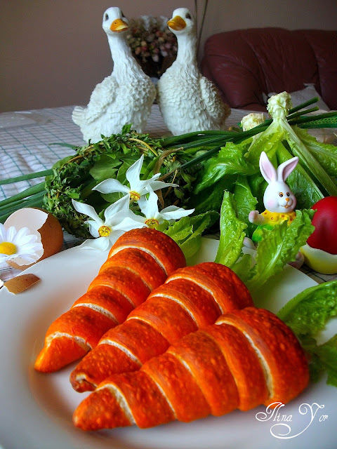 В малък съд, капваме около 30-тина капки оранжева безвредна боя. Ако нямаме, смесваме червена и жълта, може и малко кафява, докато се получи желания цвят за моркови. С четка оцветяваме тестото преди печенето му. Ако нямаме боя, може да намажем само с яйце и пак ще получим хубав ефект, защото ще печем формите до златисто-кафяво.