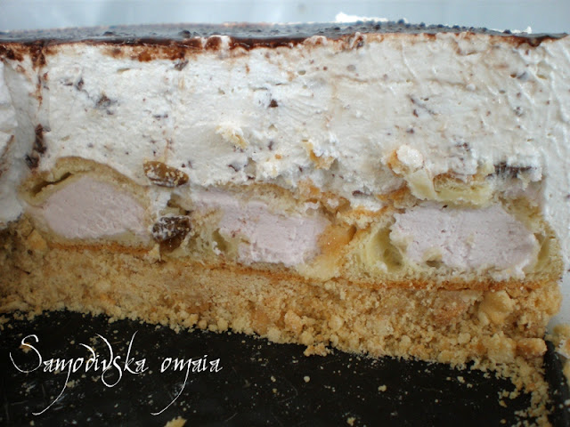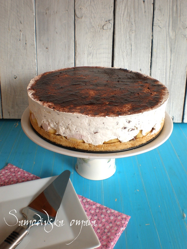 по желание към крема може да се прибави нарязан шоколад за готвене.За основата на торта:- 2 пакена чаени бисквити;
