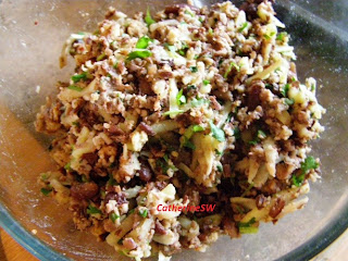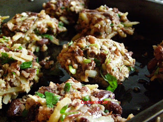 7. В миску выложить всю фасоль, добавить картофель, рубленую зелень кинзы, обжаренные лук и чеснок, яйца, хлебные крошки, перец и соль