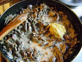 5. На масле обжарим лук, добавим грибы, порезанные ломтиком. Через некоторое время добавим растертый чеснок с перцем. В конце - коньяк