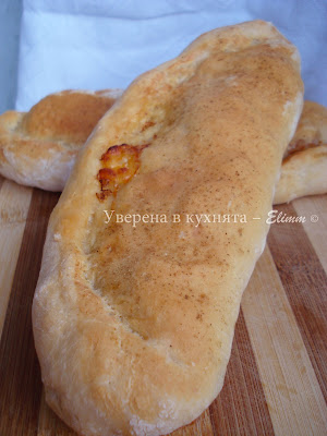 Готовото тесто разделете на четири равни части. Всяка част разточете на питка с диаметър около 25 см. В половината част на питката разпределете от плънката и покрийте с парче кашкавал. Намажете краищата на питката с вода и завийте, като празната половина захлупите върху пълната. Завийте краищата, така че да се получи борд. Подредете ги в тава застлана с пекарска хартия. Намажете с малко прясно мляко и поръсете с шарена сол. Изпечете в предварително загрята фурна на 200 гр до готовност.