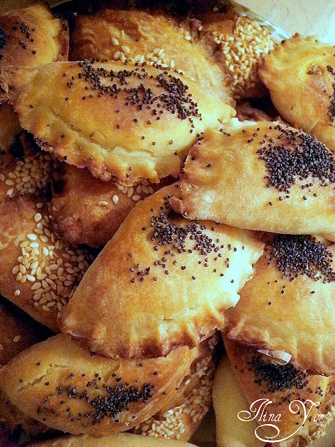 Содата за хляб се размесва в пресятото брашно. Добавят се и останалите продукти. Омесва се тесто, което оставяме на топло да престои за около 15 - 30 минути. Разточва се на дебелина около 0,5 см. Изрязват се кръгчета с формичка за бисквити или с чаша и се намазват с разтопено масло. Аз съм използвала специални формички в 3-ри различни размери (в случая най-големия), които едновремнно изрязват формата и след това се прегъват по диагонал на две, като запечатват и прищипват пълнежа. Това разбира се може да стане и с ръка.