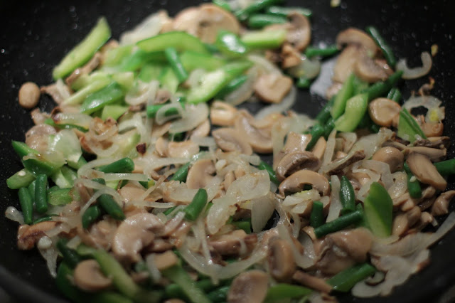 Добавить перец, стручковую фасоль и обжаривать пока перец не станет мягким..