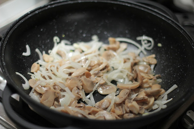Добавить грибы и обжарить до чуть румяного цвета грибов.