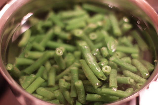 Стручковую фасоль отварить в кастрюльке. (в кипящую воду на 3-4 минуты)