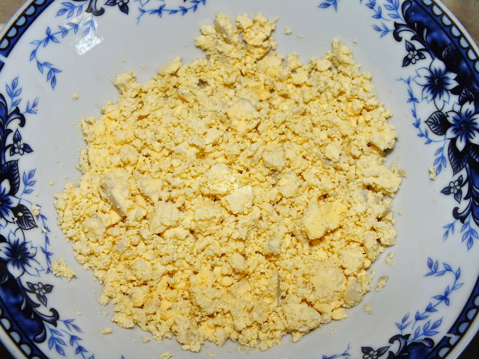 Каждое яйцо разрезать на половинки и аккуратно ложечкой выбрать желтки. Желтки нужно размять вилкой
