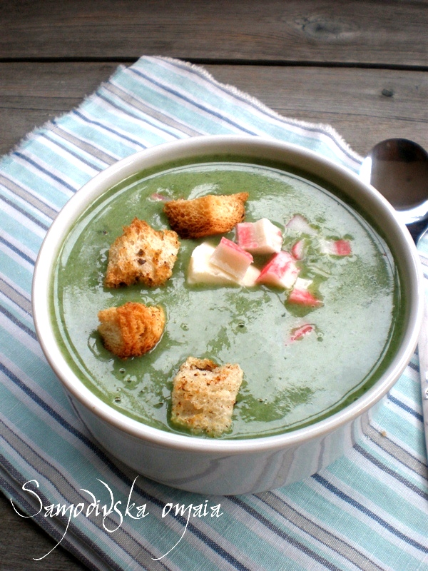 Поднася се с парченца моцарела /или друг тип сирене, аз залагам на синьото/, късчета рулца от раци и крутони.