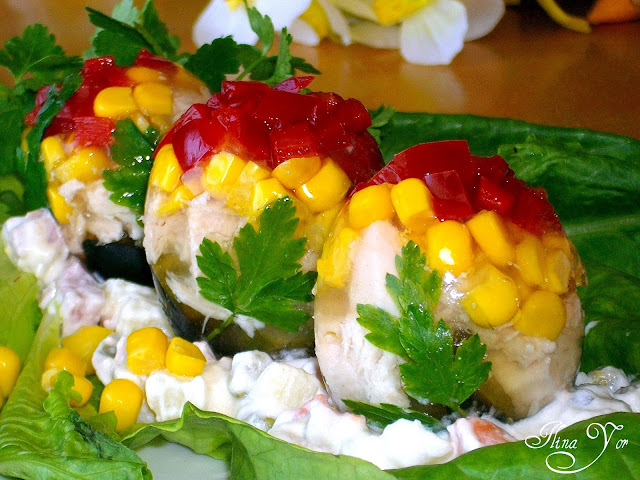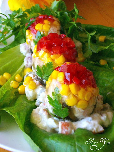 9. Първо, закрепете зелените листенца по стените отвътре и червения пипер на дъното.на черупките. После добавяте царевицата, филето, граха (краставичките), маслините и заливате с бульона до където е възможно.
