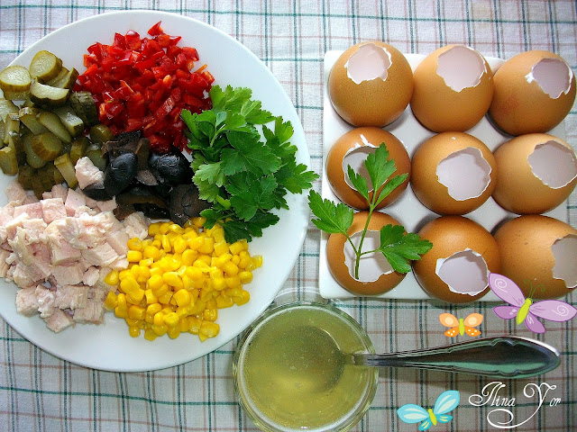 9 бр. черупки от яйца; 200 – 300г сварено пилешко филе; 2 – 3 с.л. консервиран грах (мариновани краставички); 2 – 3 с.л. сладка консервирана царевица; 1 бр. сладък червен пипер (пресен); 5 - 6 бр. обезкостени черни маслини; 2 с. л. желатин; 1 ч.ч пилешки бистър подсолен бульон; Зелени клонки от копър, магданоз и др.;